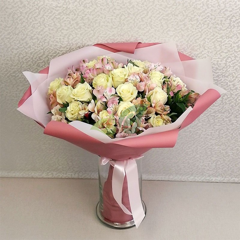 Изящный букет “Парижанка” – это свежие белые розы и розовые альстромерии в композиции на заказ с доставкой. Благодаря объемности роз и альстромерии этот букет нельзя назвать маленьким.